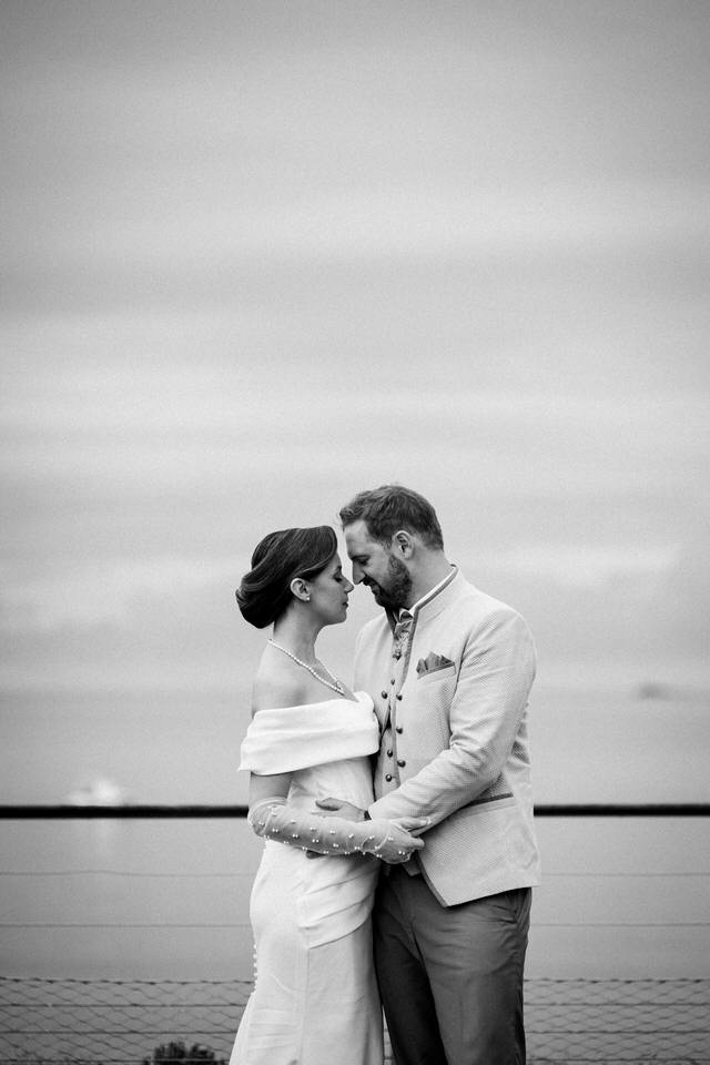 La suite des festivités s’est déroulée dans un cadre idyllique : la maison familiale du couple, idéalement située en bord de mer. Le cocktail, les pieds presque dans l’eau, a été un moment de pure convivialité. Les invités ont pu profiter de la vue imprenable, savourer de délicieux mets et trinquer à l’amour des jeunes mariés sous un ciel aux couleurs chatoyantes.